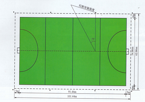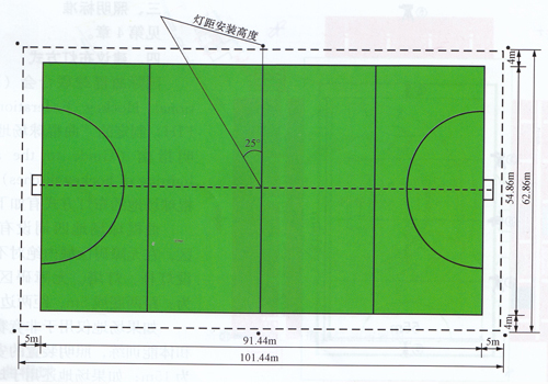 如果場地僅用于非競賽類比賽和體能訓練,照明裝置的安裝高度為15m,如果場地還用于球類訓練和俱樂部比賽,設計時要考慮眩光的影響,照明裝置的安裝高度至少要18m。