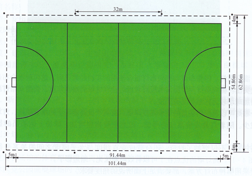 曲棍球場地四周設有無障礙區,在障礙區域內絕對不允許裝設燈桿,燈塔。無障礙區域最小為:距兩底線5m,距兩邊線4m。