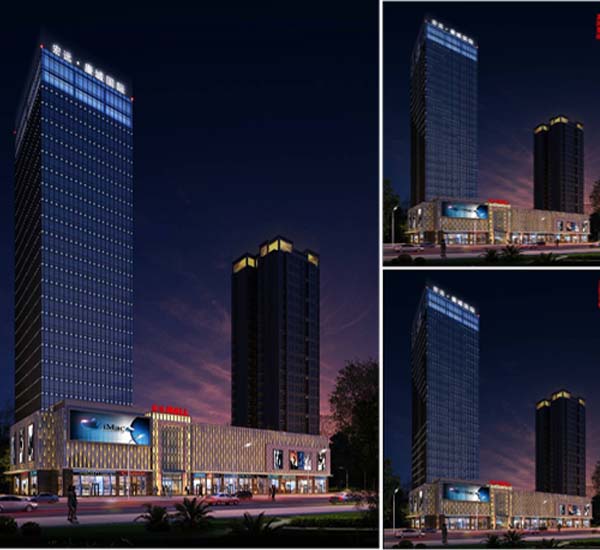 整體燈光以簡潔大氣為主,裙樓商業以表現熱鬧而雅致的氛圍為主,用小壁燈和內透搭配表達,主樓立面用LED點光展現,點光安裝于室內,見光不見燈:建筑頂部微微透出的燈光搭配著LED發光字,與航空障礙燈共同闡述遠視的效果,整體燈光輕靈飄逸,簡潔優雅。