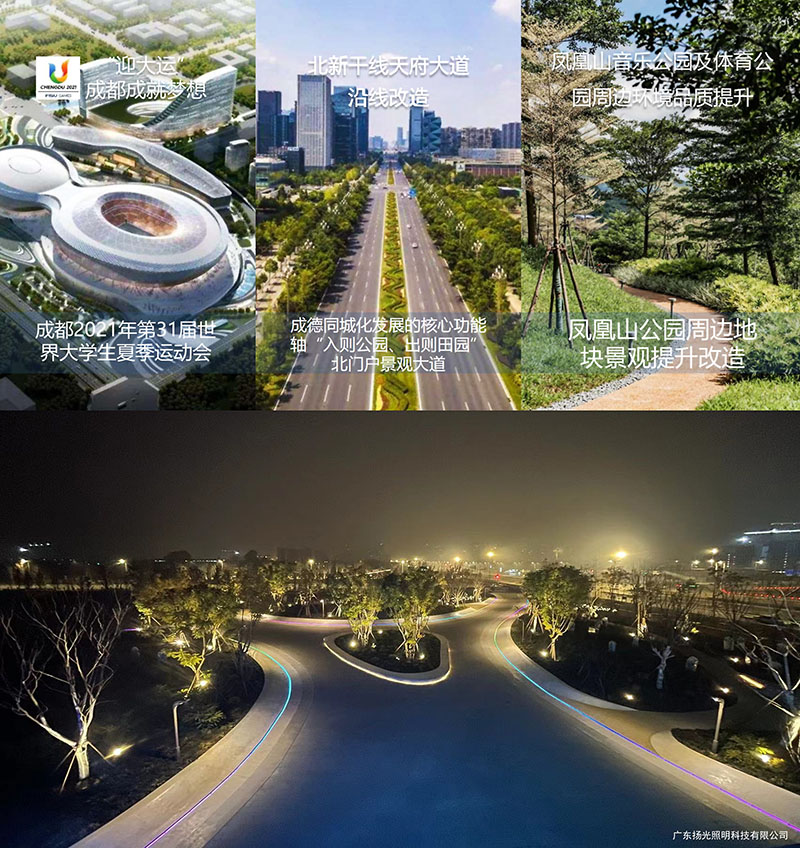 北星大道是成都向北聯系德陽的主軸,也是2021世界大學生運動會的重要賽區所在地。而整個片區夜晚環境不足以表達區域特色,因此對北星大道兩側,鳳凰山露天音樂公園及國際足球中心周邊場景進行整治,既是大運會期間的風貌展示,也是城市發展的重要需要。